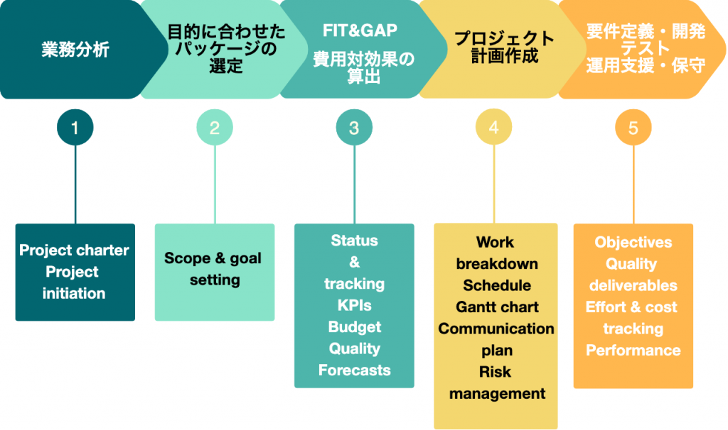 そうならないためには、自社の「業務分析とプロセスの整理」「FIT&GAP率算出」「費用対効果」「KPI設定」「投資回収期間の目処」について、事前の十分な検証が必要となります。